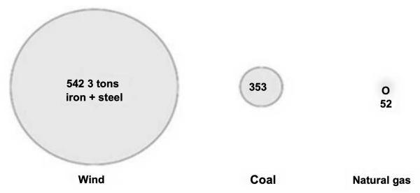 Stated bluntly, the table showed that the LCOE, or Levelized Cost of Electricity, will cost five to eight times more than advertised for a simple onshore CCGT plant. (The detailed cost elements and assumptions are presented in Appendix B.) The above adjustments highlight how intermittency and integration challenges erode the advertised advantages of renewables, including up to 8% losses due to voltage fluctuations. The figure below compares the raw materials required for the three alternatives. Imagine all the fossil fuels used to mine, smelt, forge/cast, shape, assemble, transport to the sites, and install for an onshore wind plant.
