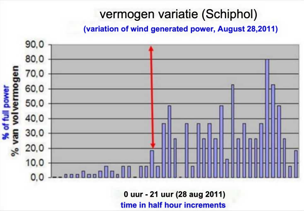 The figure below, from the Schiphol Airport wind farm, vermogen variatie (Schiphol) (variation of wind generated power, August 28,2011) illustrates the dramatic variations in the amount of electricity produced by the wind vs. the Peaker. Blue bars depict wind output variability over half-hour intervals, while red arrows show Peaker adjustments to achieve precise 100% compensation. This constant modulation significantly increases fuel consumption. As physicist C. Le Pair notes, such dynamics often result in net increases in fossil fuel use and CO₂ emissions, as wind installations may not offset the embodied fossil fuels used to build them.